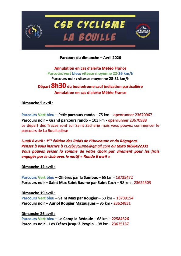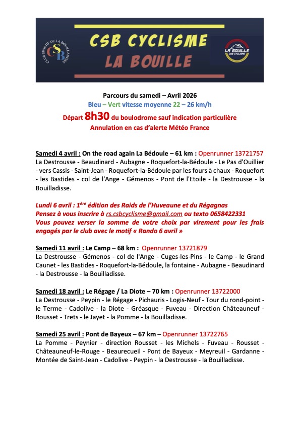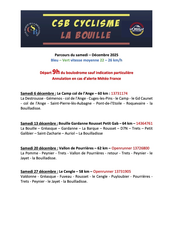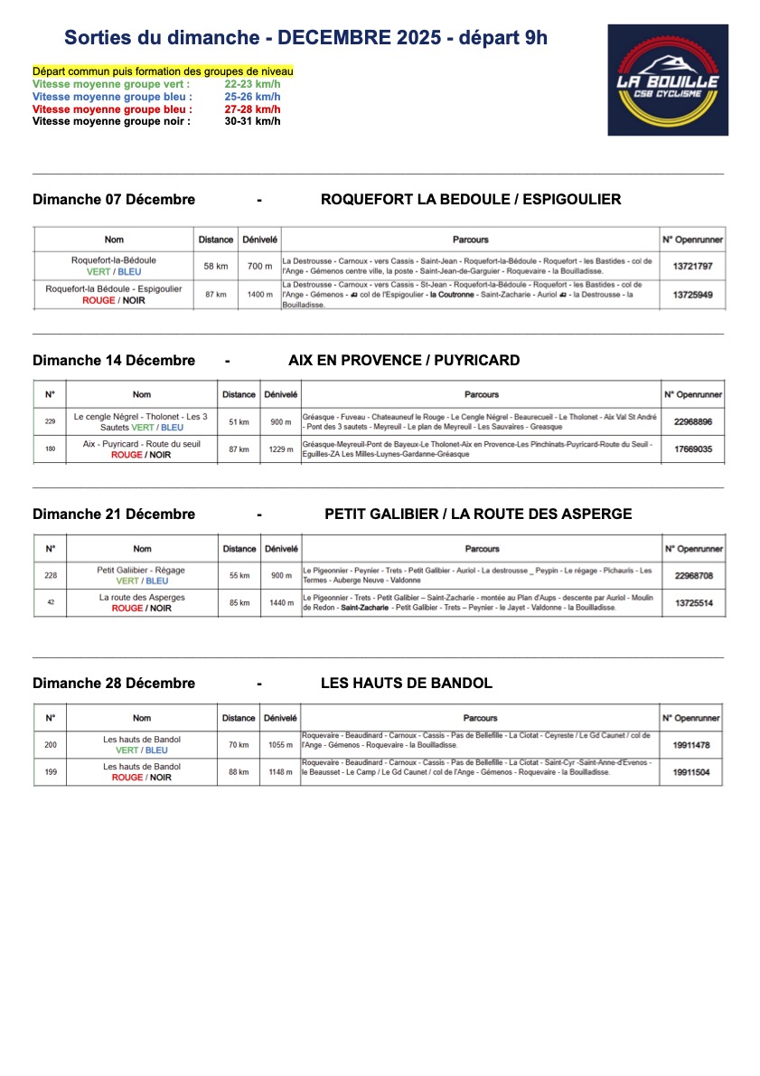 Les choix des parcours sont réalisés de manière réfléchie et prennent en compte les allures moyennes des différents pelotons. Celles-ci bien entendu dépendent des difficultés du jour. Dans les choix faits, beaucoup de paramètres sont pris en compte pour que le groupe, sur un parcours donné, soit rentré pour midi, midi et demi avec les allures suivantes :